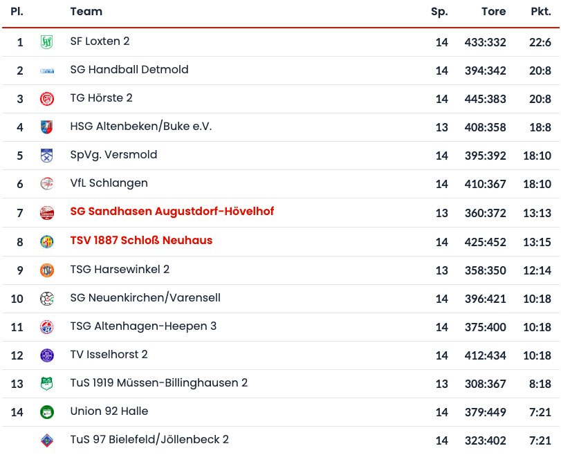 Der TSV Schloß Neuhaus spielt bislang eine starke erste Saison in der OWL-Liga. Mit 13 Punkten stehen die Gäste aktuell auf dem 8. Tabellenplatz und sind punktgleich mit den Sandhasen, haben jedoch bereits ein Spiel mehr absolviert.